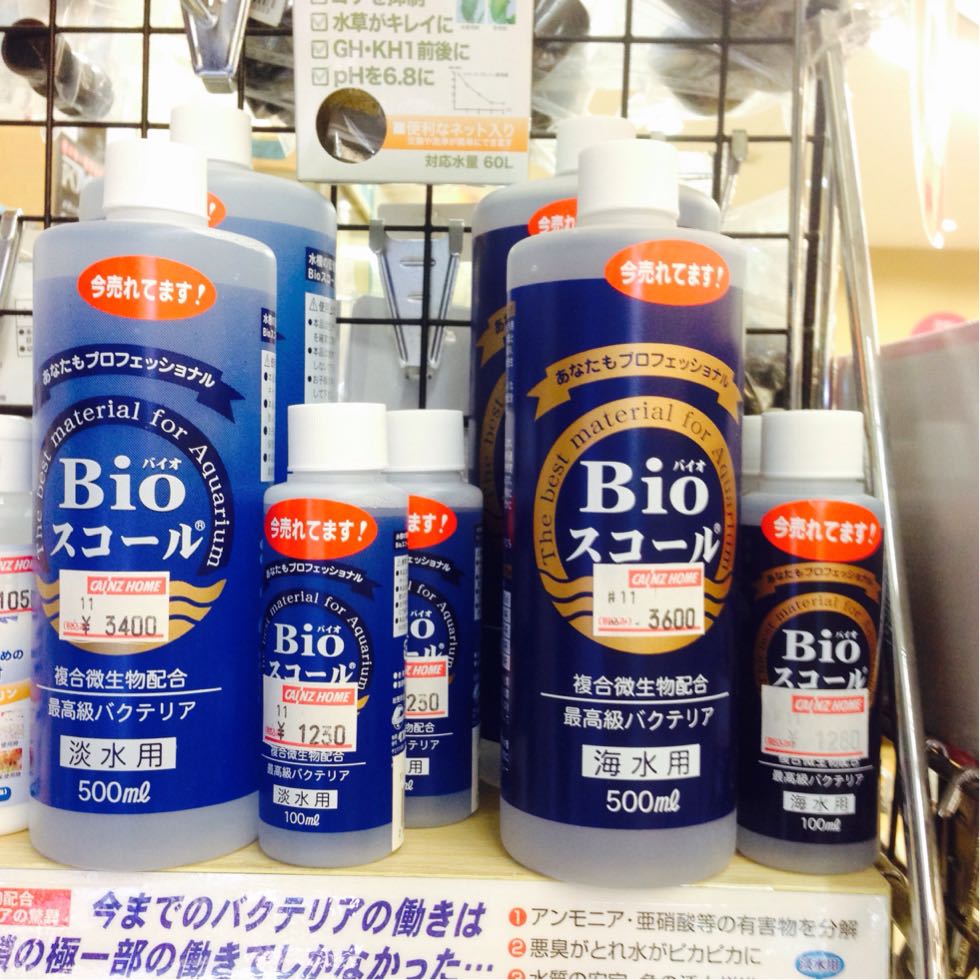 お水の管理に欠かせないバクテリアですが、Bioスコールのいいところは、複合バクテリアで、普通のバクテリアよりもすごく小さいので、多孔質なところにぐんぐん住み着き、がんがん仕事します♪